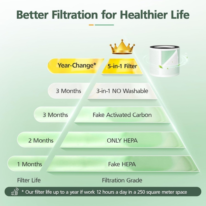 So với các bộ lọc khác thường phải thay mỗi 1–3 tháng, Bộ lọc 5-in-1 HEPA thay thế cho Máy lọc không khí AEOCKY Pandora có thể sử dụng: