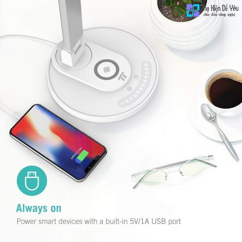 Ngoài ra, đèn còn tích hợp cổng USB 5V/1A, giúp bạn sạc thêm điện thoại, tai nghe hoặc phụ kiện khác ngay trên bàn làm việc – một chiếc đèn, nhiều tiện ích.