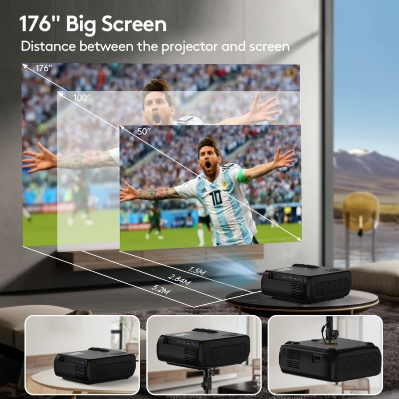 Màn chiếu rộng từ 50–176 inch, tỷ lệ chuẩn 16:9 (hỗ trợ 4:3), khoảng cách chiếu 1,5–5,2 m, đáp ứng mọi nhu cầu giải trí.