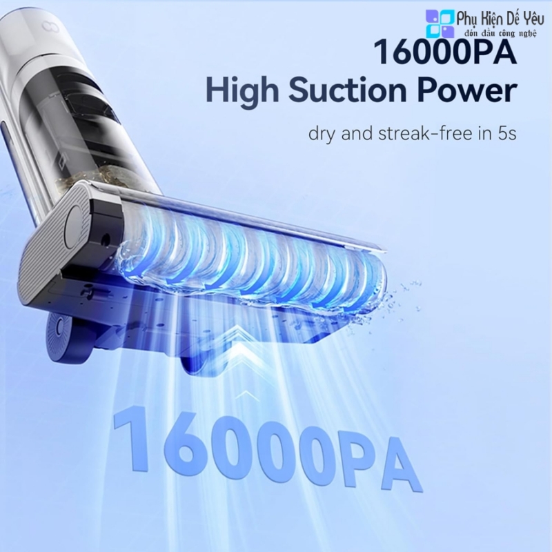 Lực hút 16.000 Pa mạnh mẽ, dễ dàng loại bỏ bụi mịn, mảnh vụn và các loại chất bẩn cứng đầu trên sàn cứng.