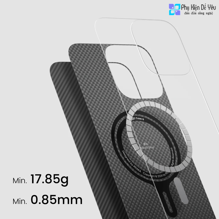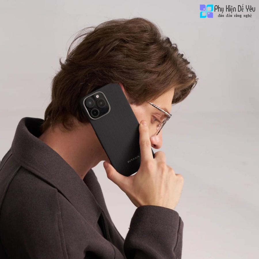 Được chế tạo từ sợi aramid cấp hàng không vũ trụ, các phiên bản Ốp PITAKA Ultra-Slim mang đến cảm giác cầm nắm thoải mái, nhẹ như lông vũ, mà vẫn giữ iPhone gọn gàng trong túi. Độ dày chỉ 0,9mm, trọng lượng ~20,65g, giúp trải nghiệm sử dụng hàng ngày nhẹ nhàng và tiện lợi.