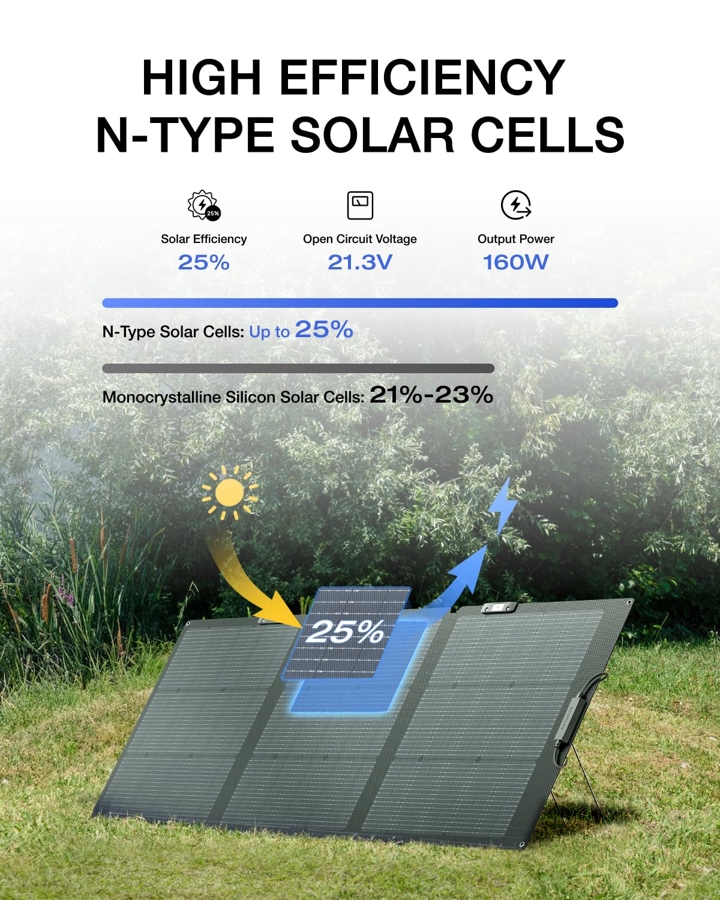 Tấm pin mặt trời di động ECOFLOW NextGen 160W ứng dụng công nghệ loại N mới nhất, giúp tăng hiệu suất chuyển đổi lên đến 25%, vượt trội so với các dòng tấm pin thông thường.